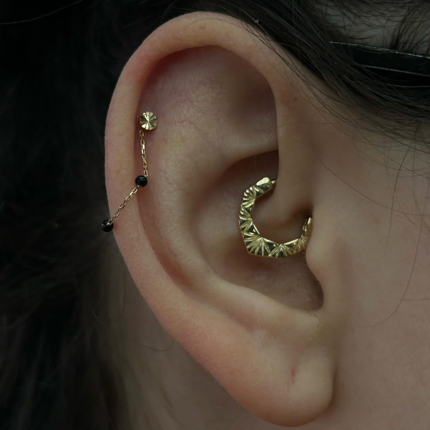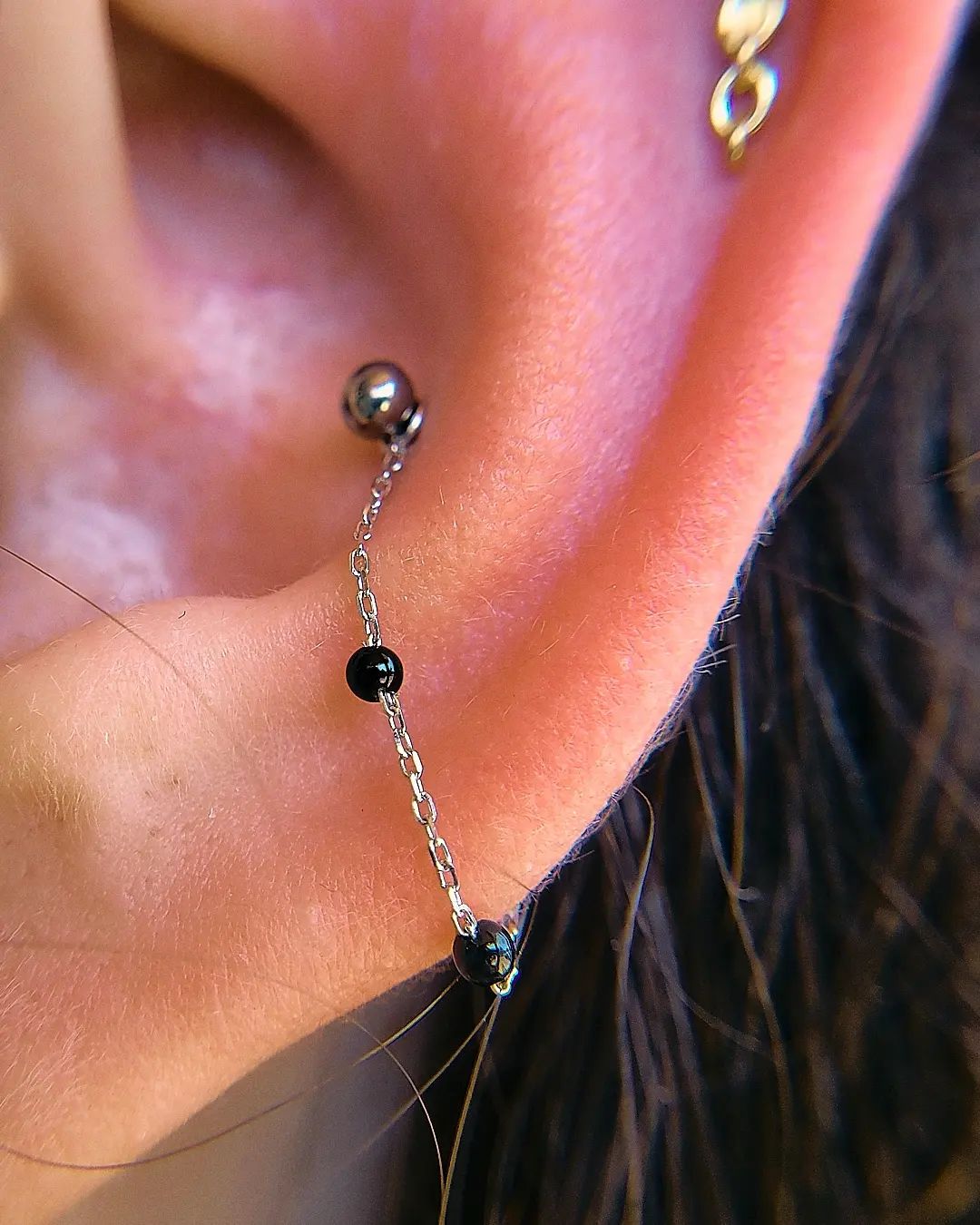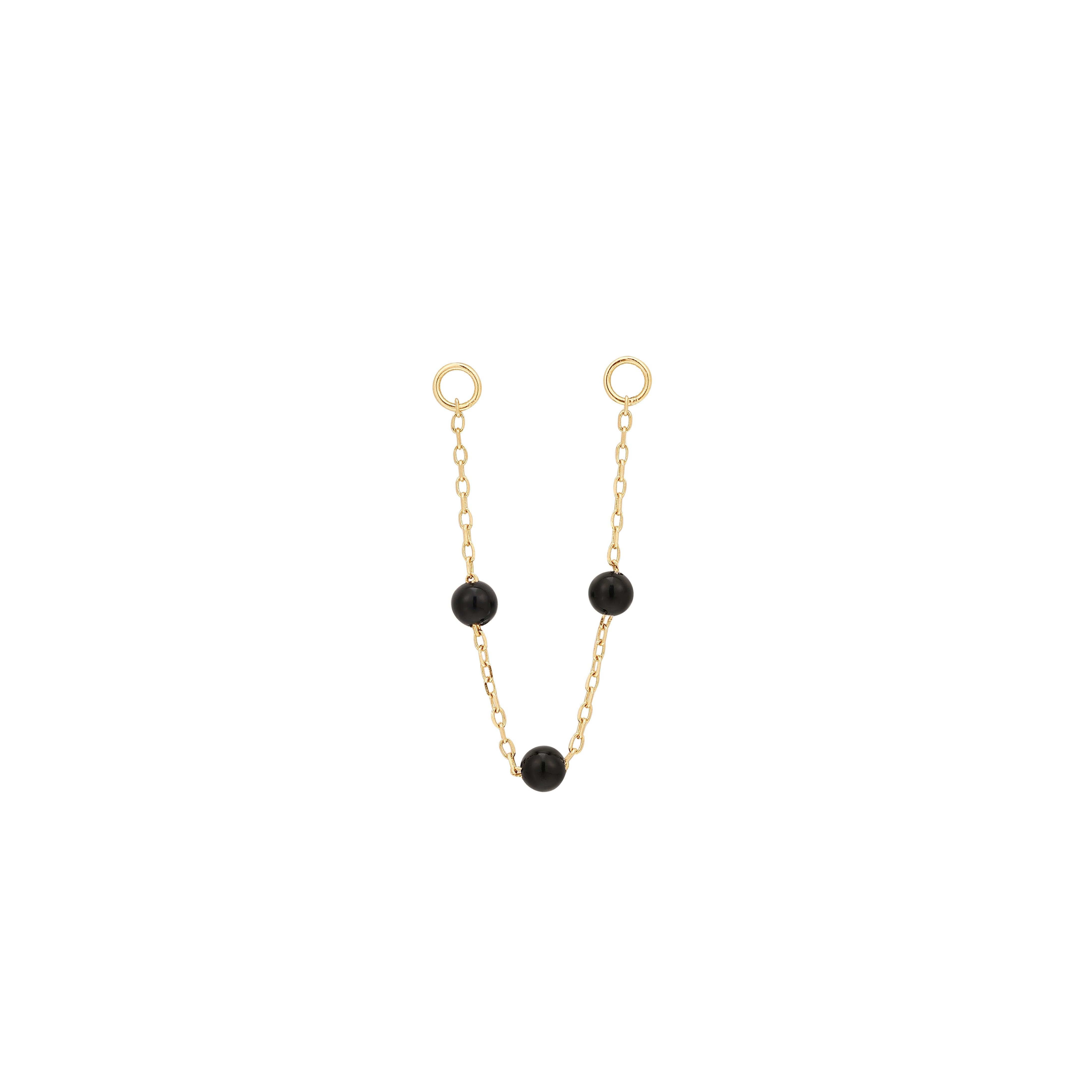 A bewitching fusion of magic and movement, the 3 Bead Agate Chain is here to elevate your piercings! This unique design features three 2mm Agate gemstones suspended on a 38mm chain with jump rings that accommodate both 18g and 16g rings or posts.