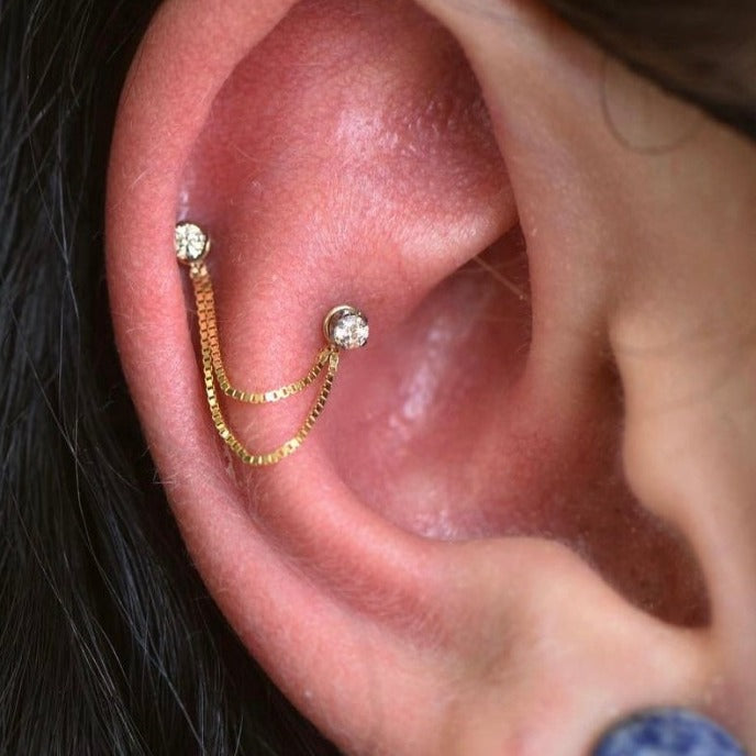 Upgrade your existing look with our double box chain! By placing the jump rings on the front and back of the piercing post this chain brings elegance to any one of our gold ends!