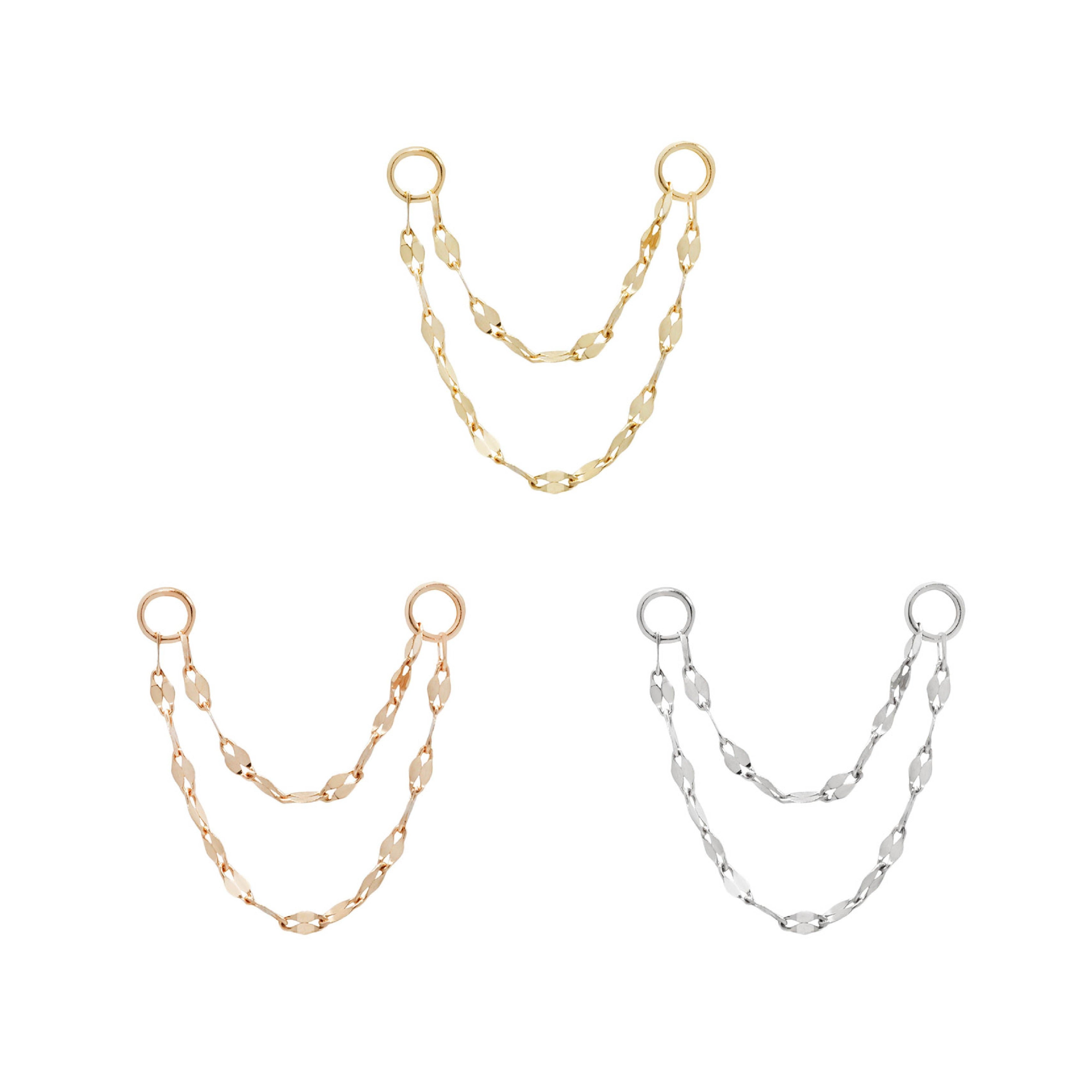 Want to make your jewelry a little edgier? Upgrade your existing look with our double tile chain! Placing the jump rings on the front and back of the piercing post adds texture, length, and variety to any of our gold ends!