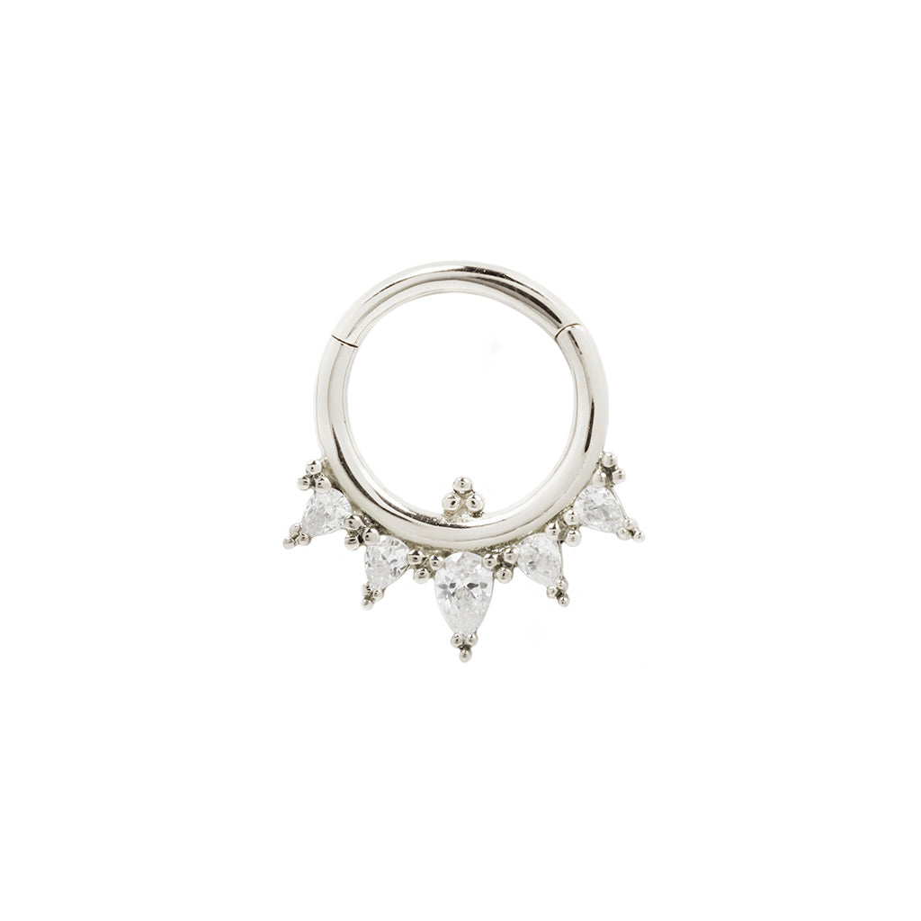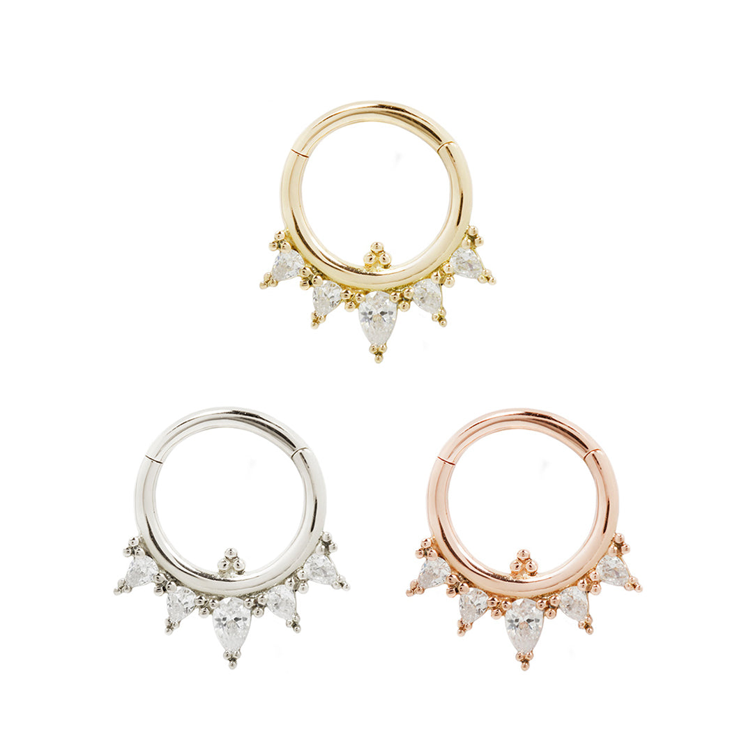 The Taja clicker features a tiara of rising pear cut CZ's, hand-done beadwork and an easy to use hinge clasp. This solid 14k gold ring was made to inspire! Perfect for anyone wanting a statement piece in their piercings!