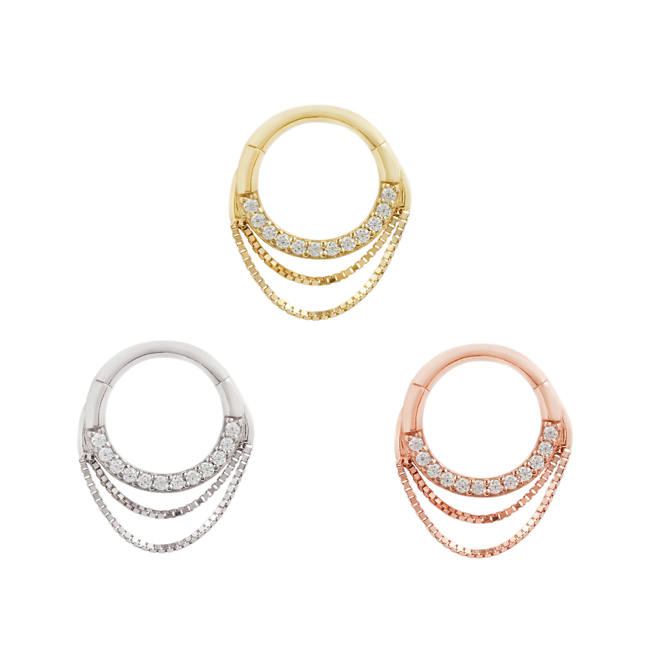 The Tempest design is a perfect choice for anyone looking for an updated classic. Solid 14kt gold with two handmade box chains gives this piece wonderful movement. The clicker has an easy hinged clasp to make inserting a breeze!