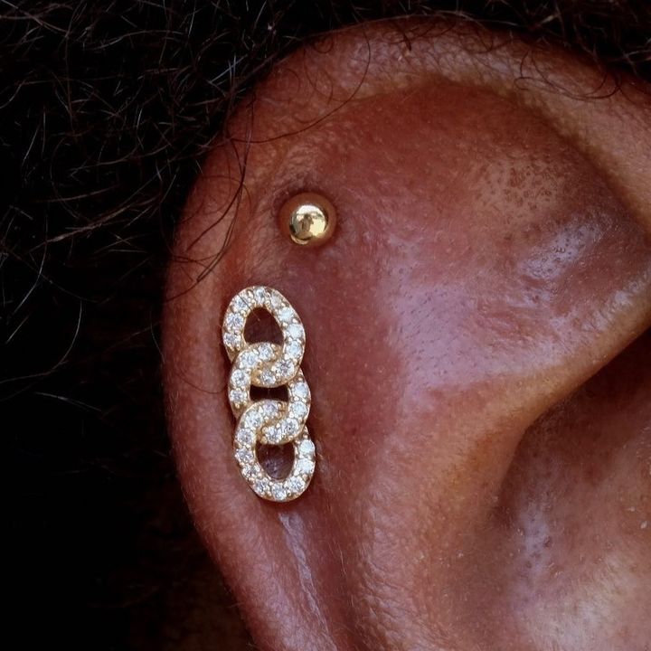 Chains and diamonds have never looked so good! Link up with this 14kt gold three link chain, embellished with genuine diamonds. The Chainlink design is a sparkling treasure that will demand attention when adorned. Place on the lobe, conch, or rook for a glittering statement.