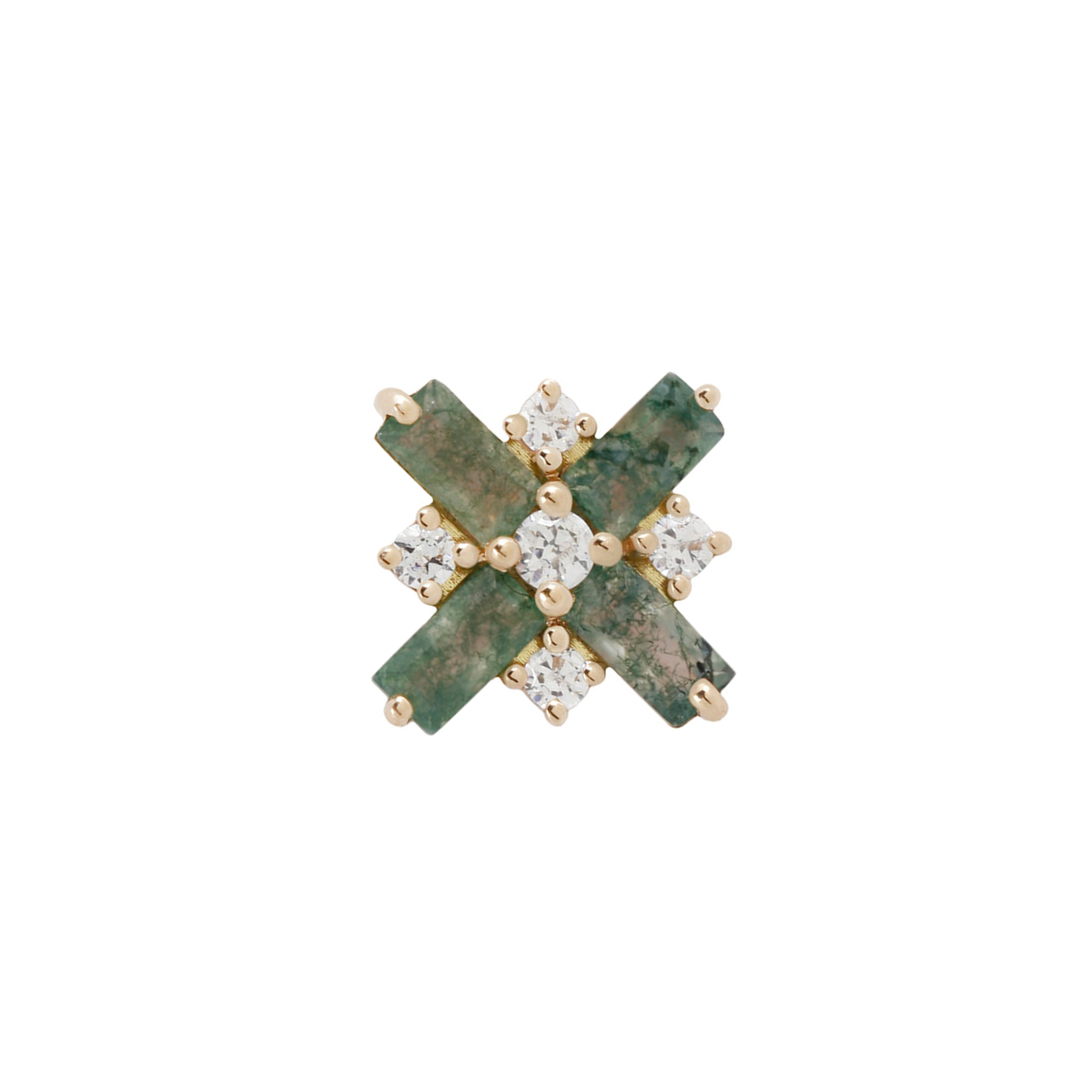 - Gemstone: (4) 3 x 1.5mm Moss Agate, (4) 1.2mm, and (1) 1.5mm Swarovski CZs