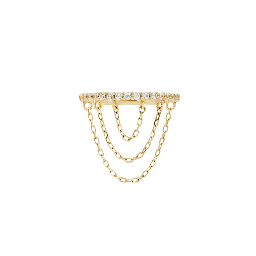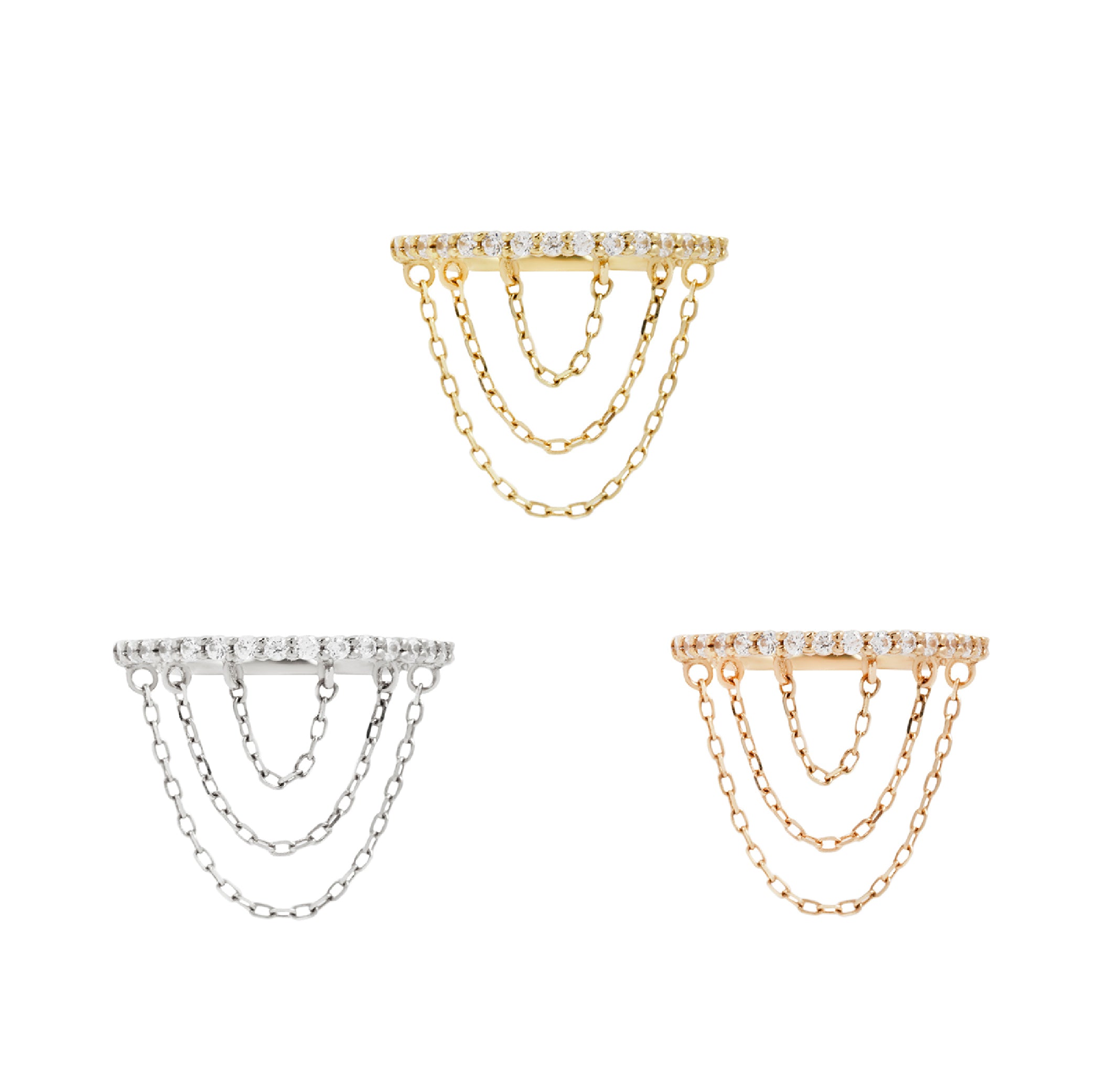 Radiate puts the spotlight on rebels gone chic! Solid 14kt gold with three handmade box chains gives this piece wonderful movement. The clicker has an easy-hinged clasp to make inserting a breeze!