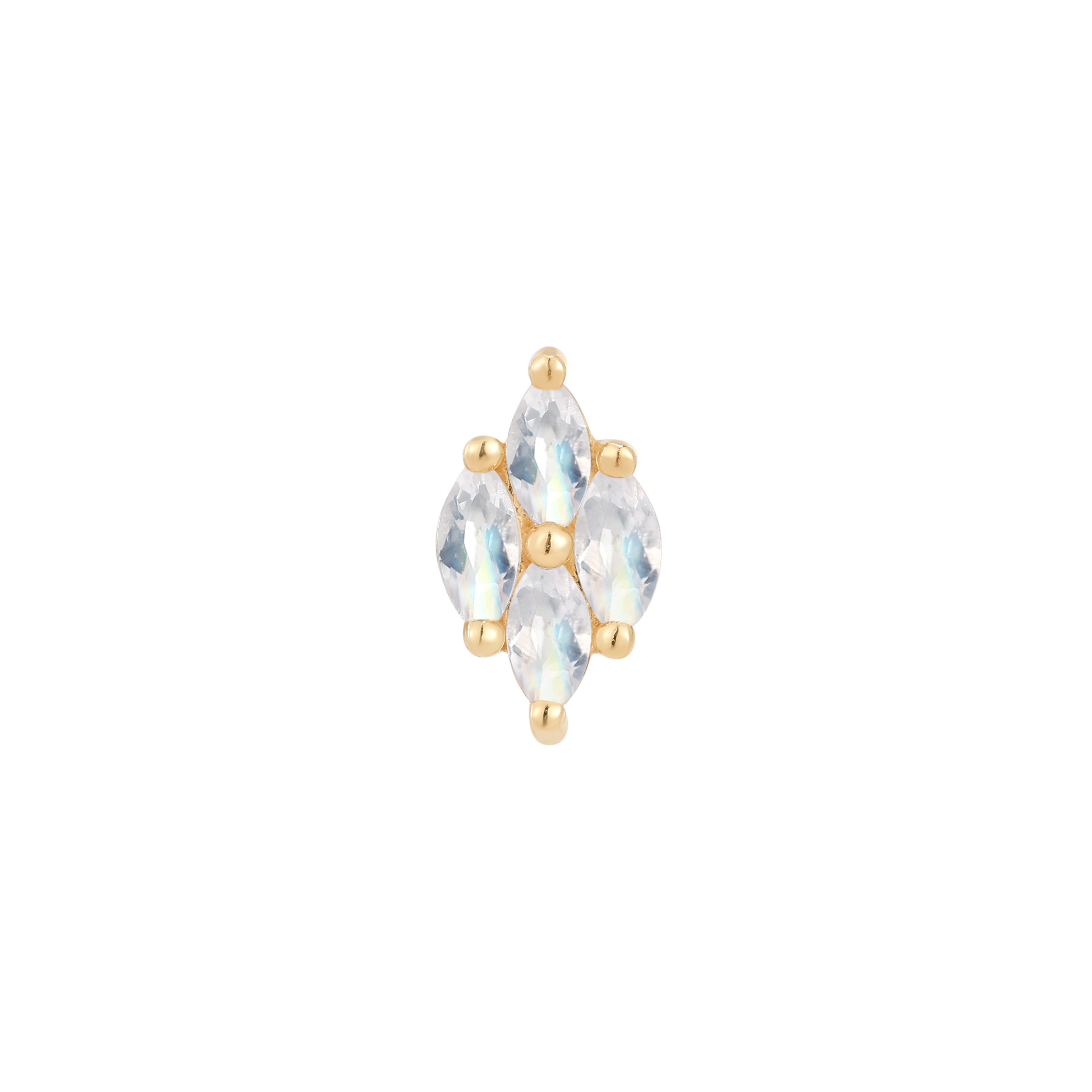 Four glimmering moonstones sprinkle a touch of magic to our iconic Dream On threadless end. Shine and dance in the light as you go about your day wearing it in your conch, lobe, helix, flat, rook, philtrum, and labret piercings.