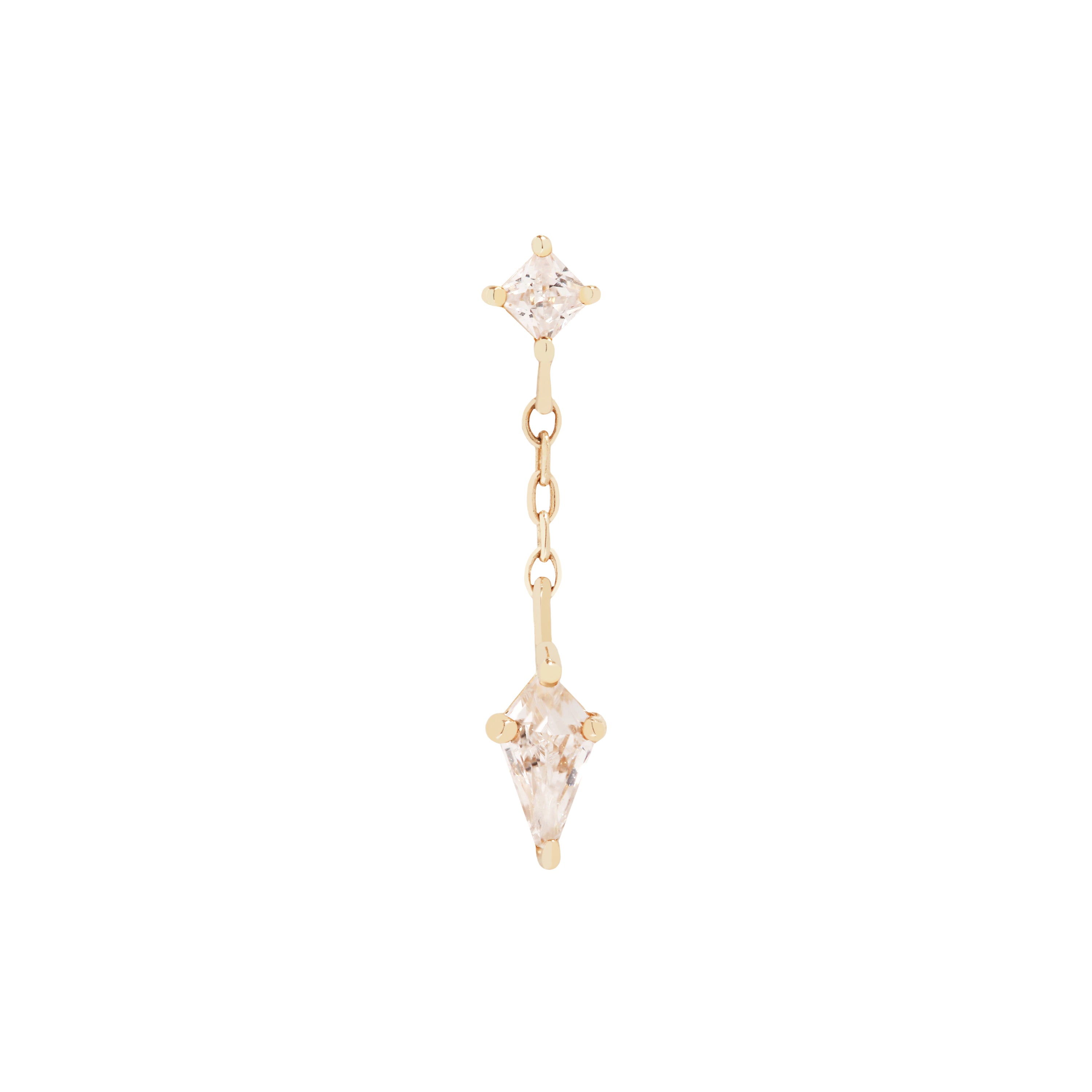 Bring movement to your ear curation with Alúm. Featuring a prong-set top and a dangling kite-cut CZ, this delicate threadless end adds a touch of sparkle and flow to helix, lobe, flat, rook, and tragus piercings.