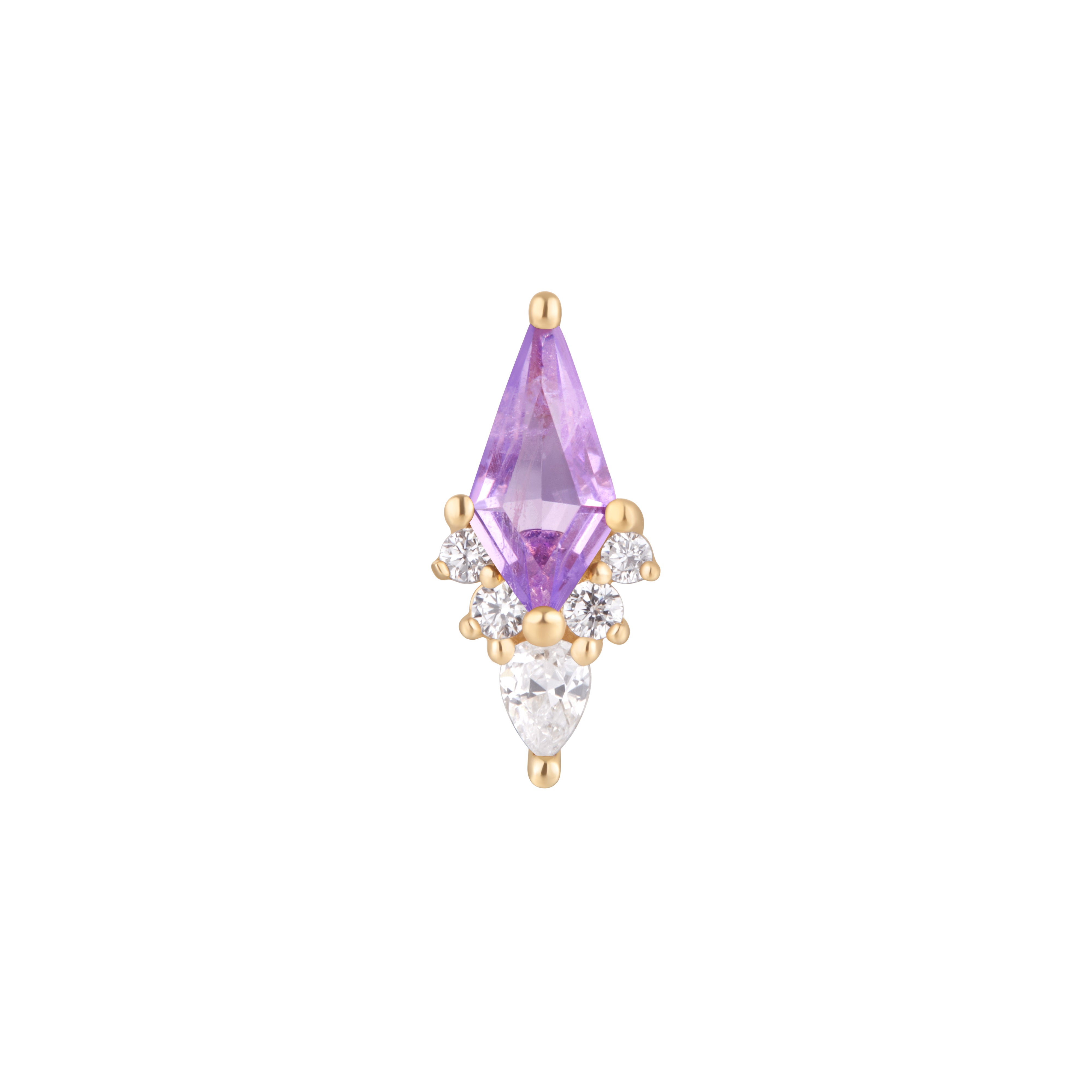 - Gemstone: (1) 6mm x 4.5mm Kite Cut Amethyst (1) 2 x 1.5mm, (2) 1mm, and (2) 0.9mm CZs