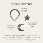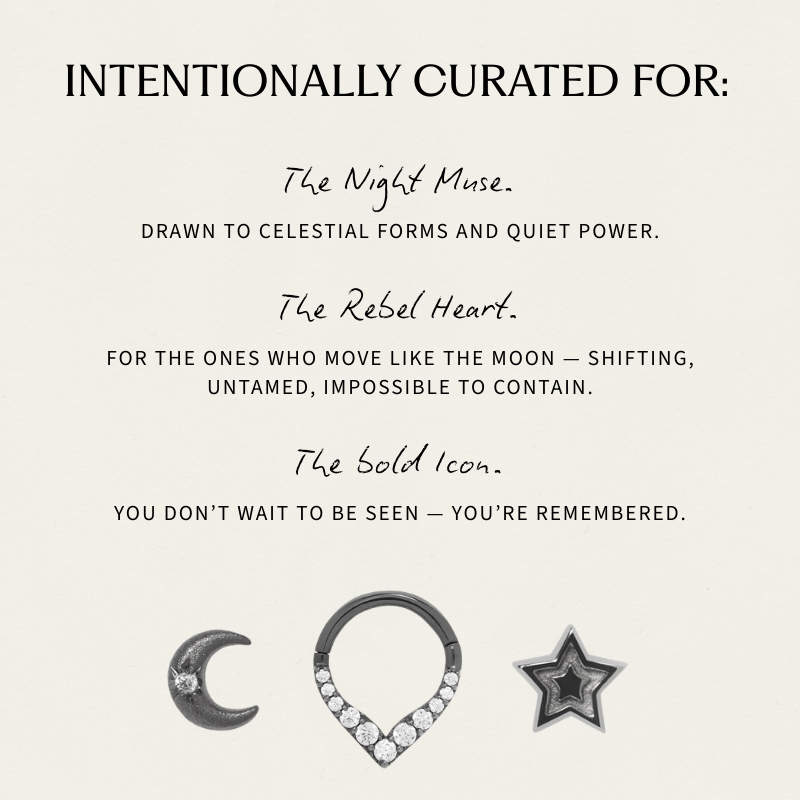 A celestial-meets-structured trio in black rhodium. Graphic silhouettes and high-contrast edge — designed to anchor your curation in something darker.