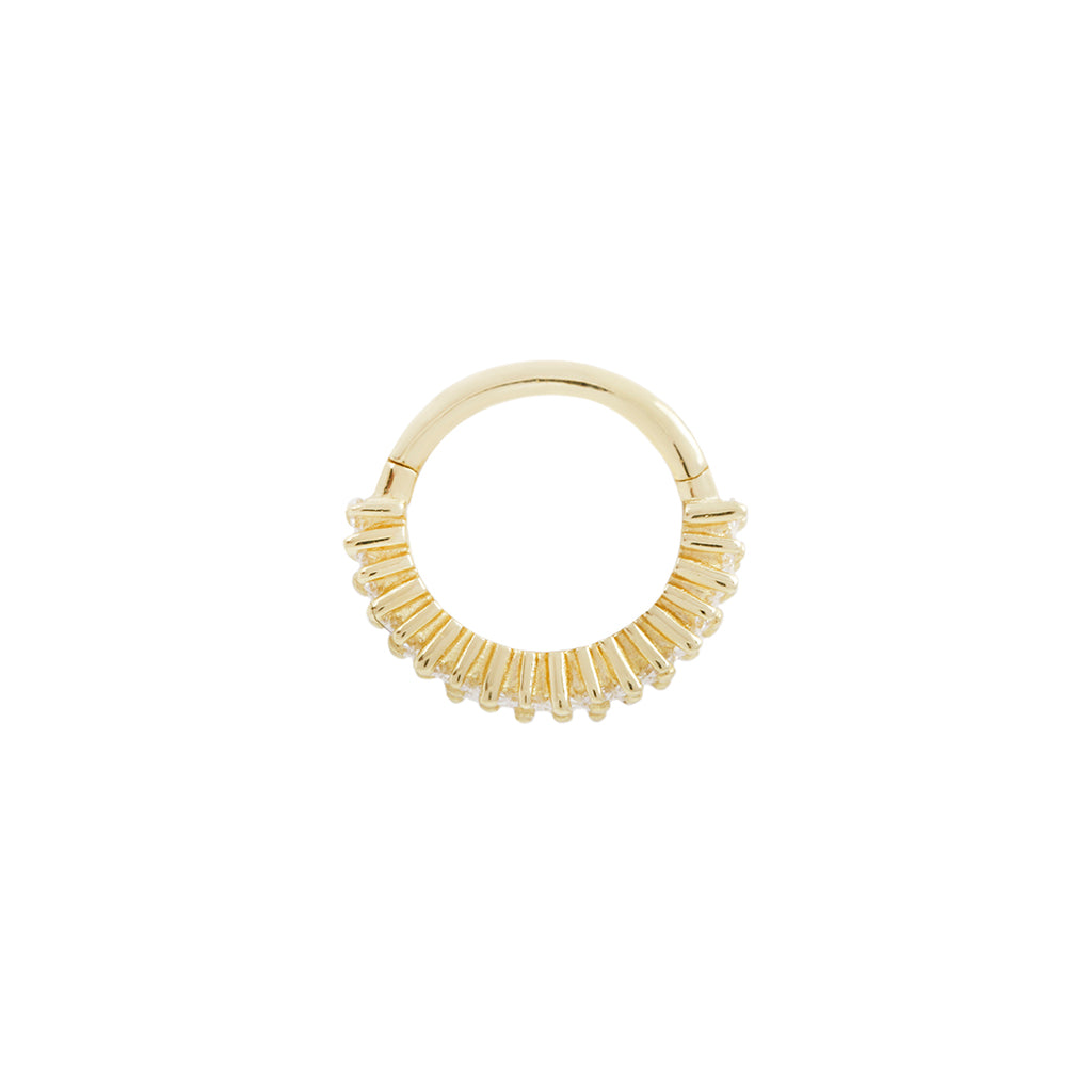 This jewelry piece is sure to be the star of the show! Our Cult Favorite clicker features baguette cut Swarovski CZs in 14kt golden chic symmetry. Wear this on the lobe, helix, or daith for the perfect spot to showcase this masterpiece. Perfect for a elegant night out on the town!