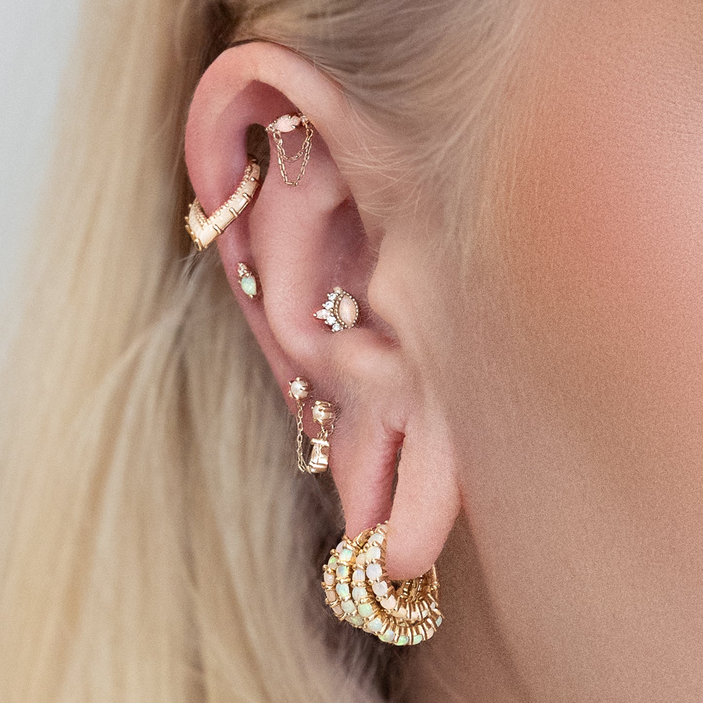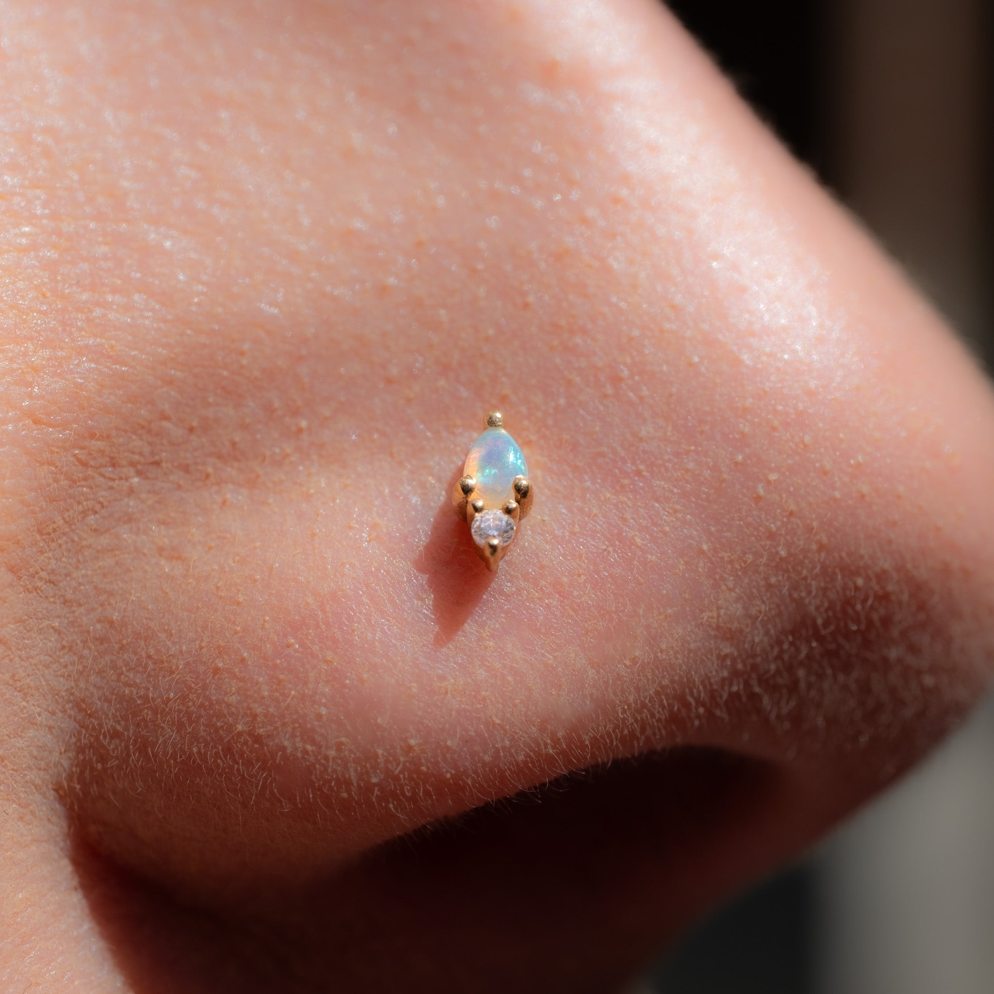 Elevate your piercing style with the dreamy allure of the Daydream Opal and CZ Threadless End. This stunning piece features a radiant Australian opal surrounded by sparkling CZ, combining to create a look that’s both elegant and eye-catching. Perfect for nose, lobe, helix, flat, tragus, and philtrum piercings!