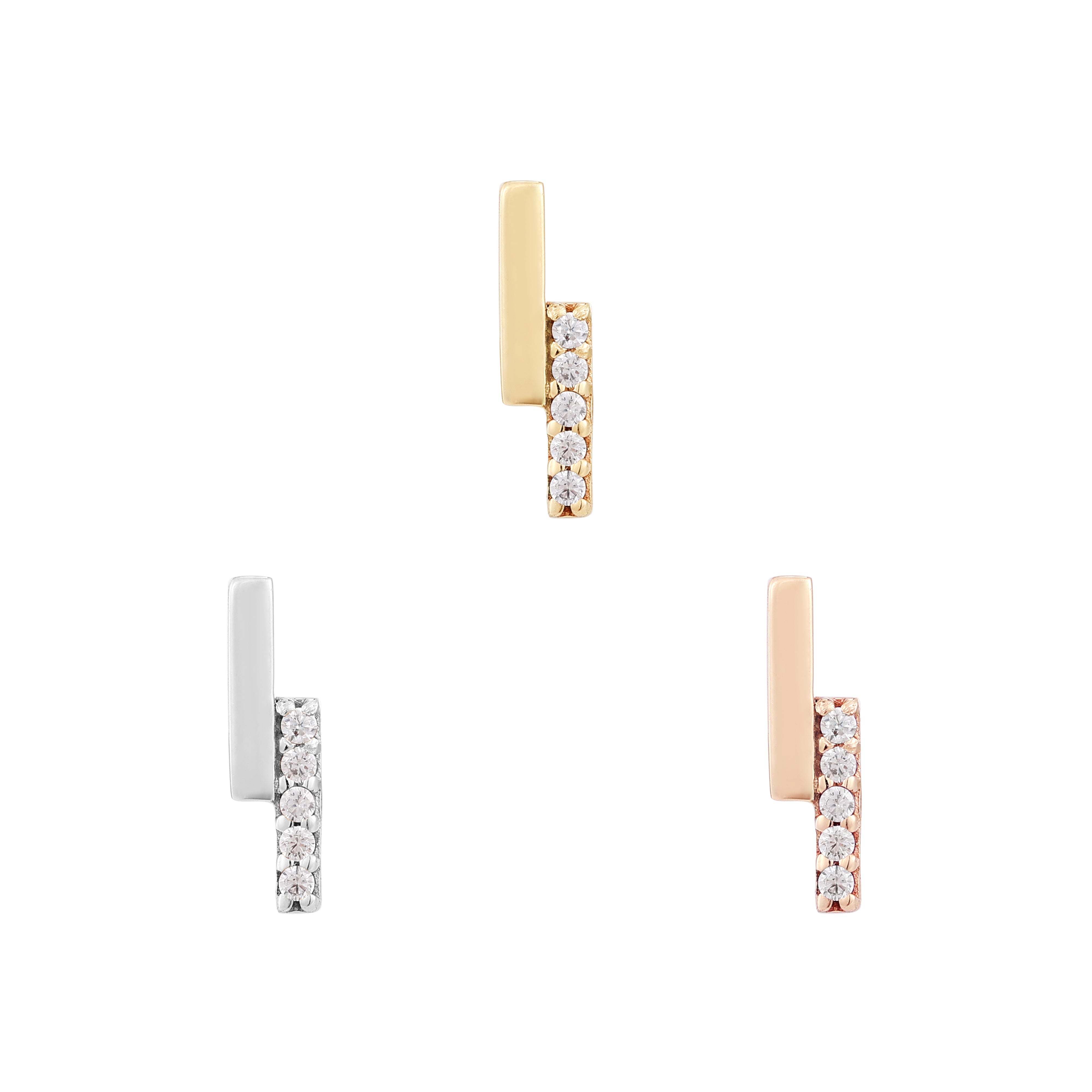 Drawing inspiration from our iconic Love Line and Rainbow Row designs, Encore is destined to become your new favorite for an elongated, minimalistic gold design. Adorned with 5 CZs, this sleek piece effortlessly complements helix, faux rook, tragus, and high lobe piercings.