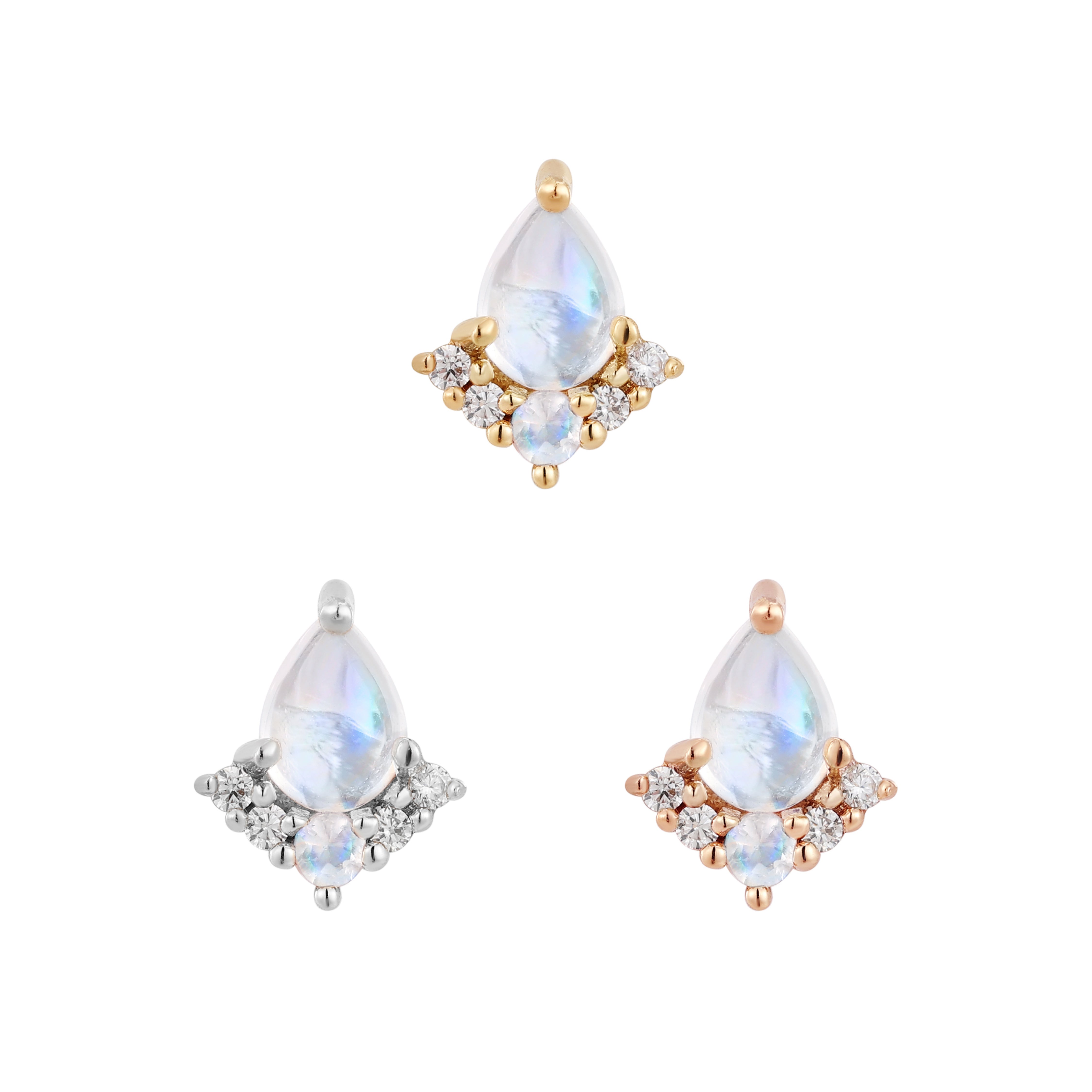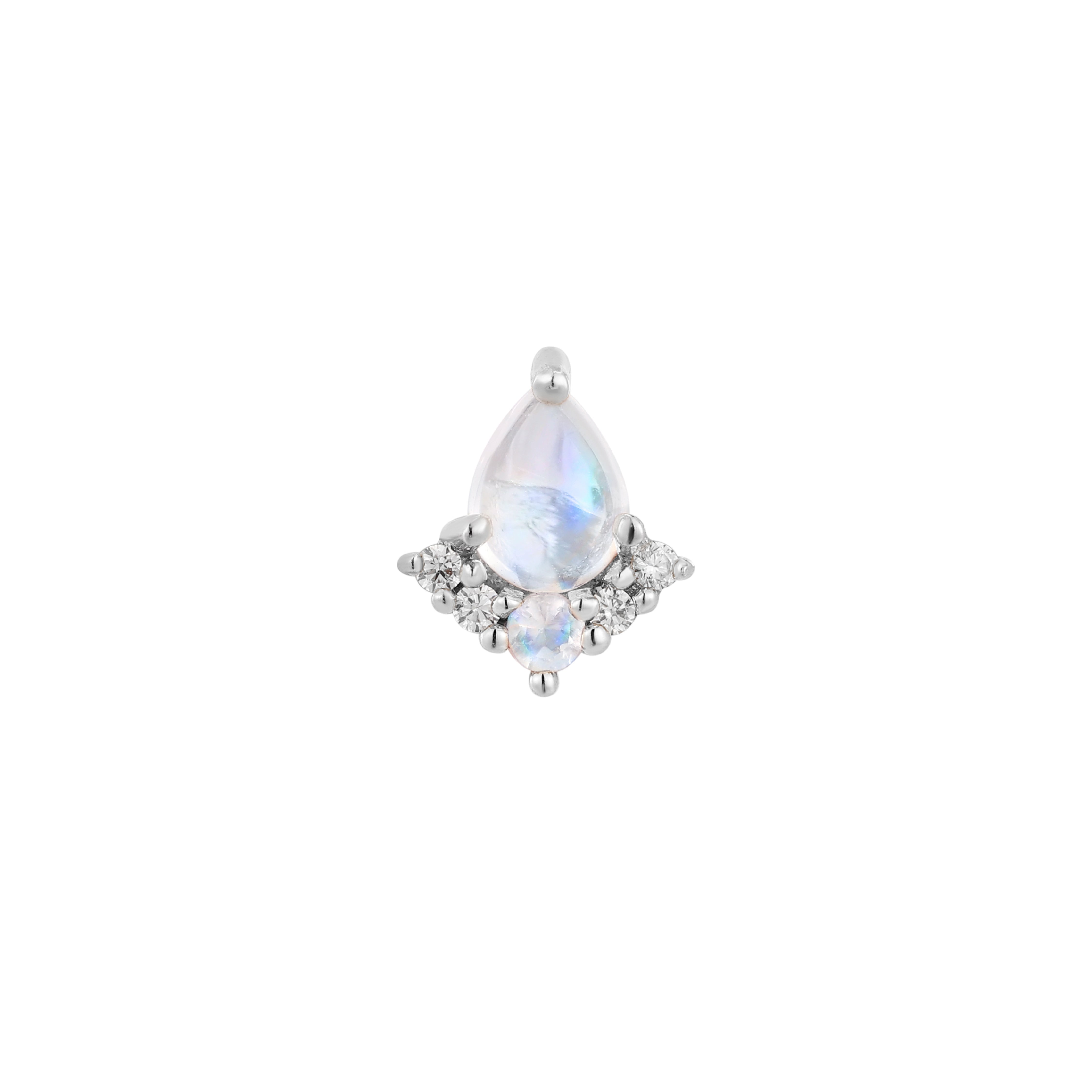 Two mesmerizing moonstones accompany four CZs. A design with balance and beauty and a dash of mystery too! Flaunt it in your lobe, helix, conch, tragus, nostril, philtrum and labret piercings.