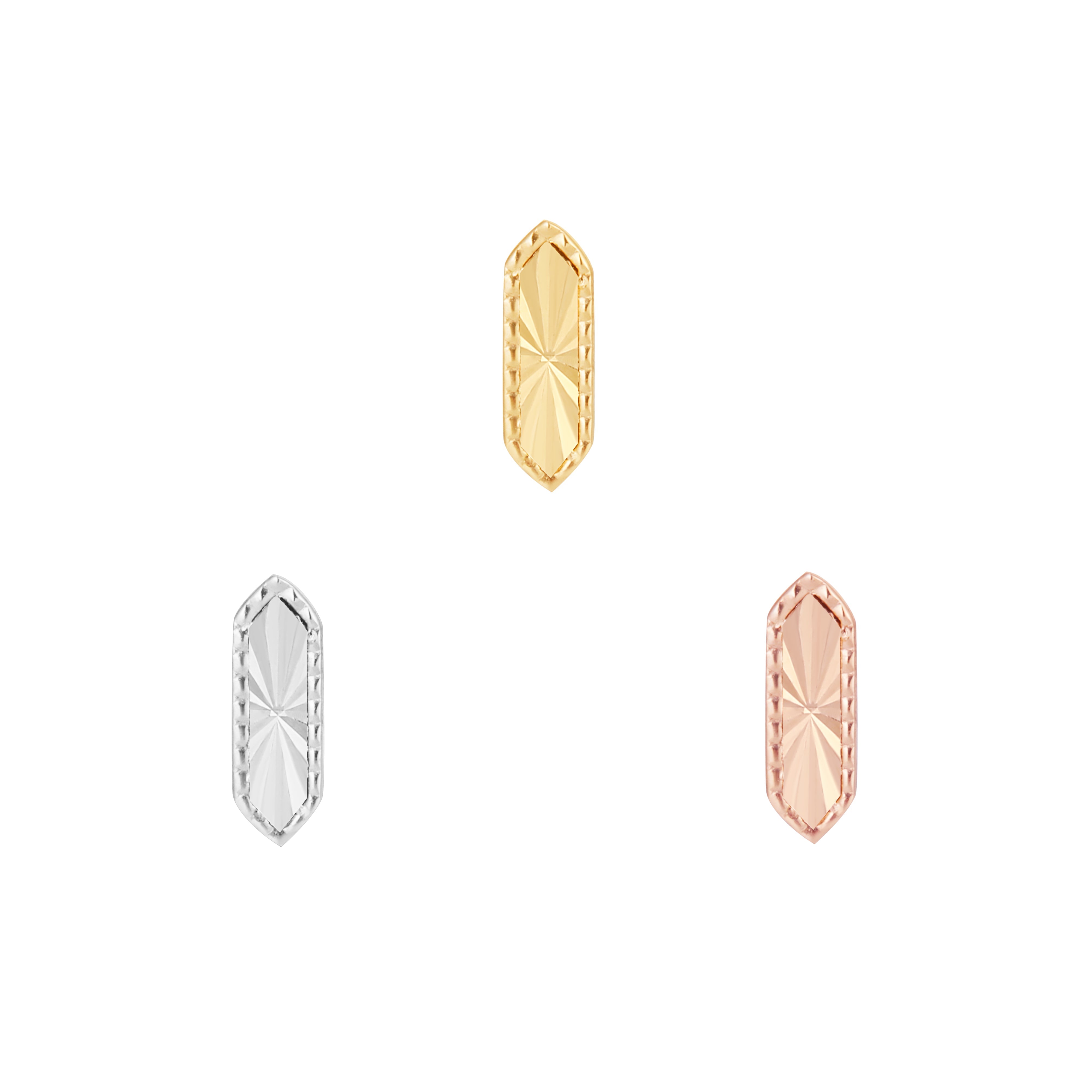 Embrace a bold essence with our "Moxy" gold design, a reflection of edgy sophistication for the chic and adventurous. Crafted with solid 14K gold and a laser-cut design, this threadless end delivers a beautiful and distinct shape that radiates confidence and personality.