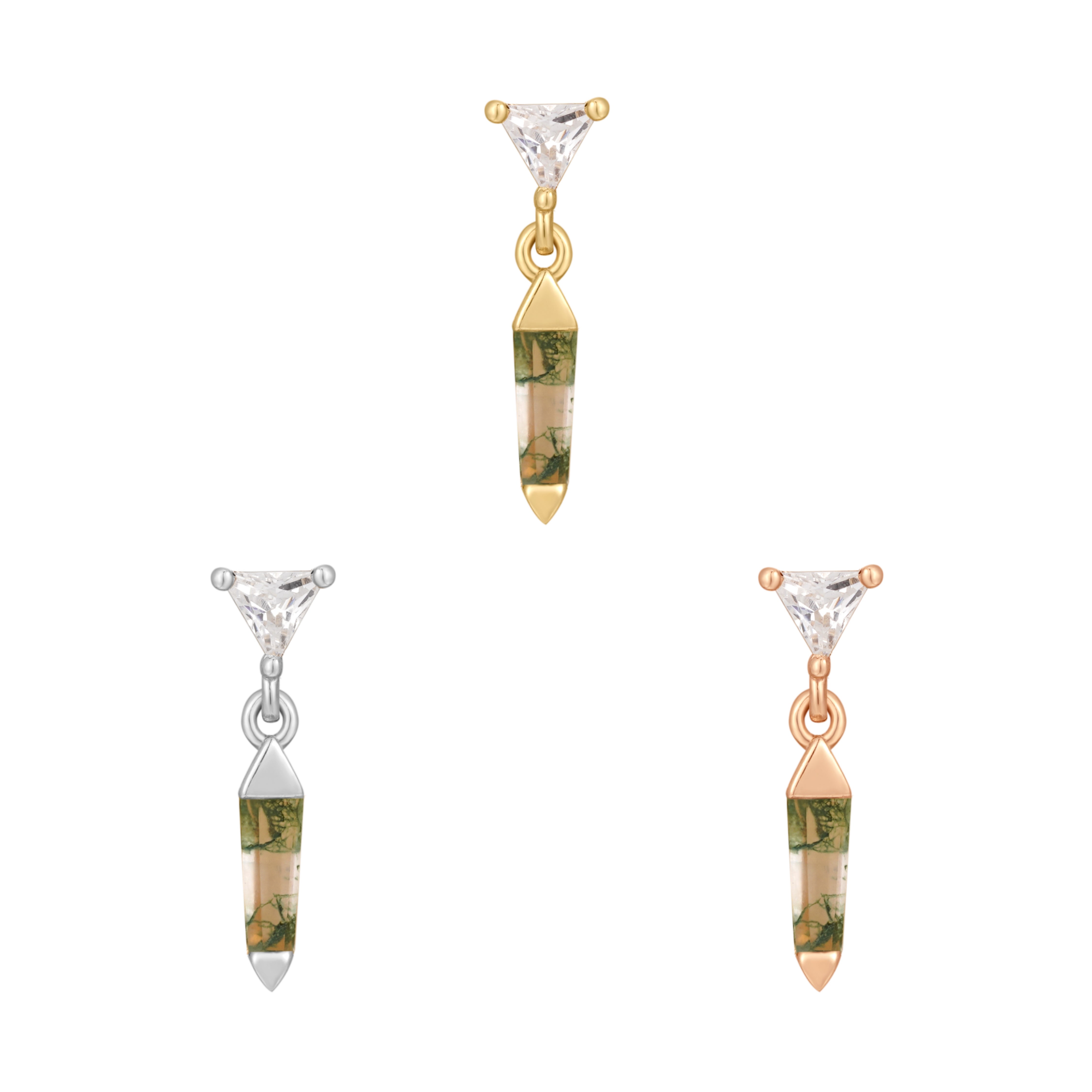 - Gemstone: (1) 4 x 1.5mm tapered baguette Moss Agate and (1) 2 x 2mm triangle-cut CZ