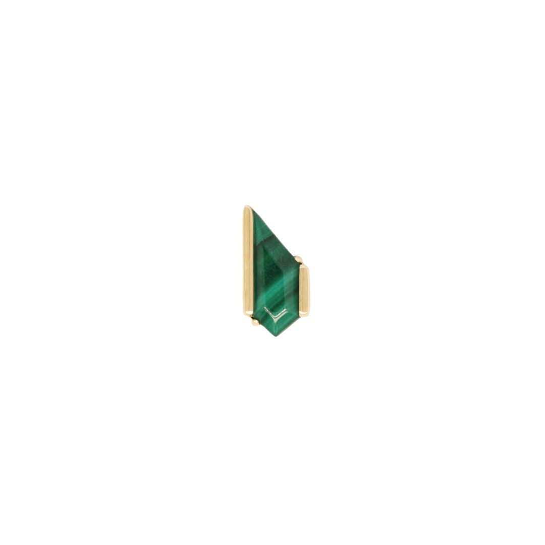 The Vinyl Malachite features a geometric cut that emphasizes the stone’s striking bands of light and dark green. Every gem is naturally individual, with patterns that create movement and depth across the surface. Bold and sculptural, it transforms malachite’s organic beauty into a modern statement.