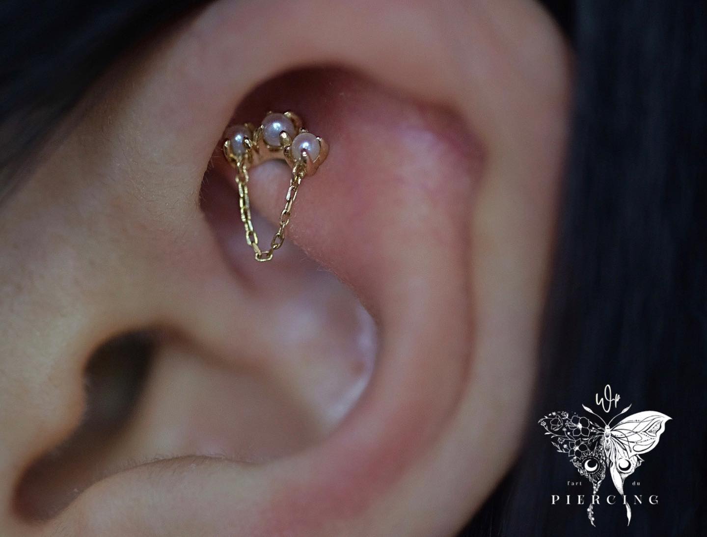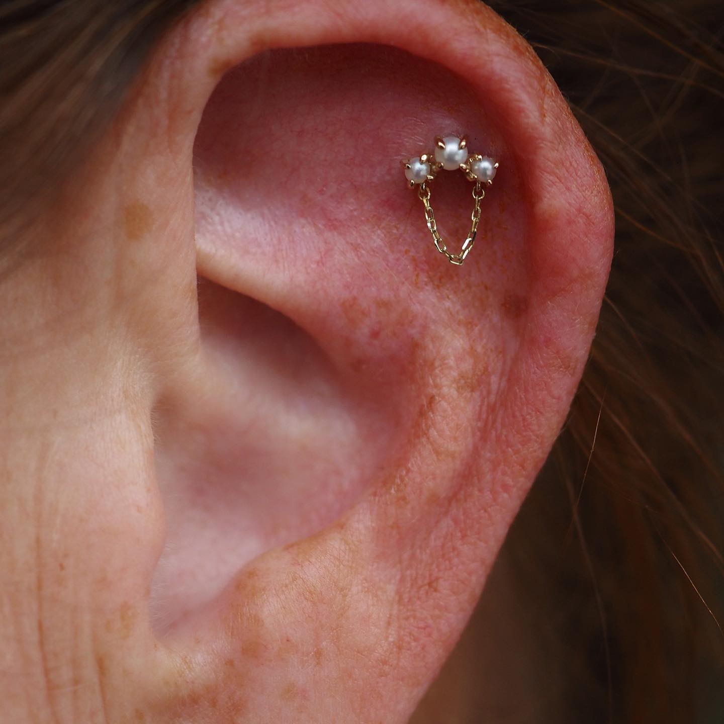 A precious tribute to our Halston collection, meet the Pearl edition! Our newest Halston features three iridescent pearls with our signature chain suspended below. Style for an edgy chic vibe in the faux rook, helix, flat, conch, and earlobe piercings.