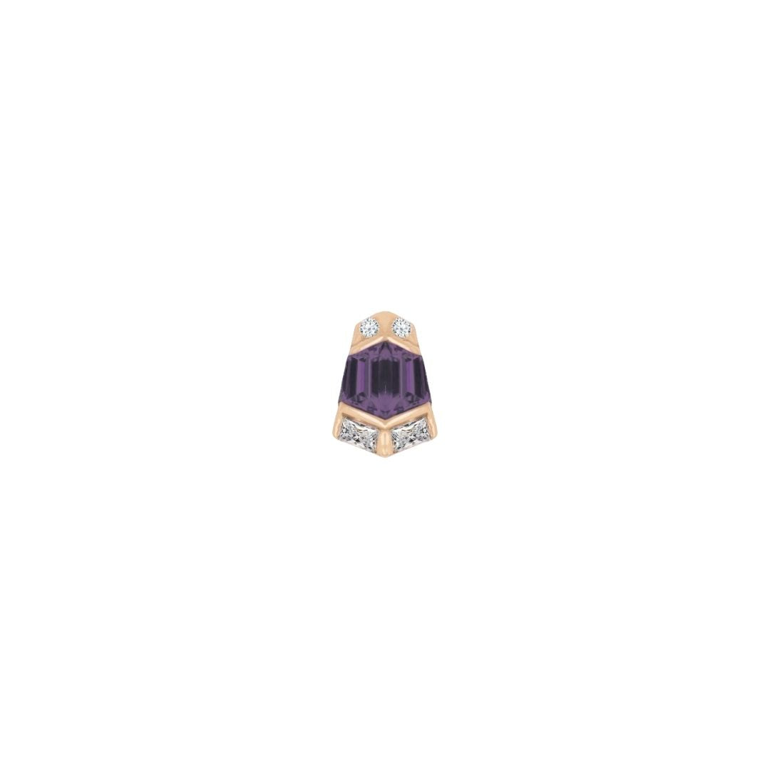 Vera in Amethyst is all angles, sparkle, and intention. Two trapezoid-cut amethysts anchor the design, flanked by baguette and round CZs for layered brilliance and dimension. A dynamic, architectural threadless end made for clients who love bold symmetry and rich color.