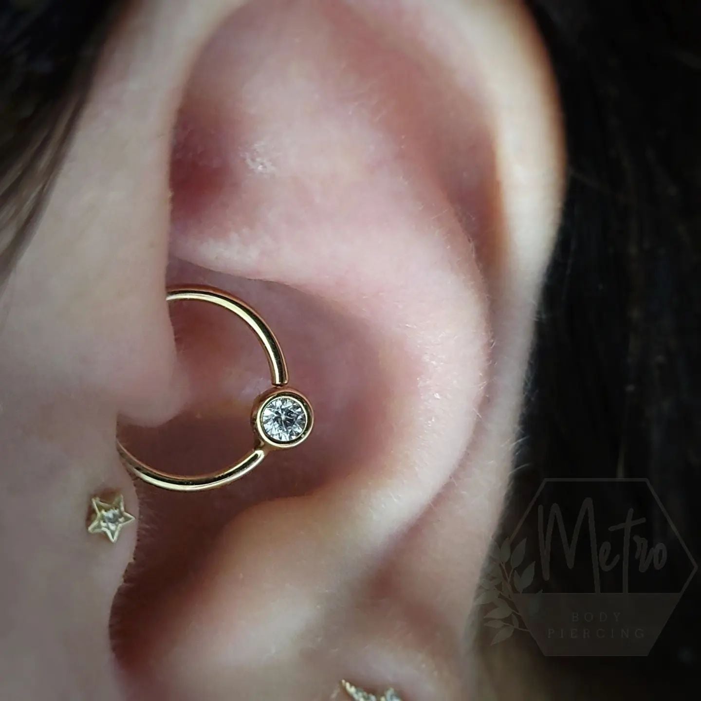 Dazzle on the daily with our classic solid 14k gold fixed bead ring, adorned with a sparkling 2mm bezel-set CZ gemstone. This piece is a go-to for initial piercings like the septum, daith, or helix. Snag one in just the right size to complement your unique anatomy!