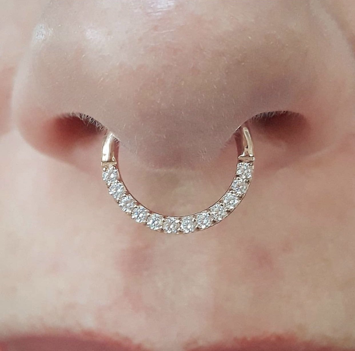 Classic elegance is always in style! Dia is the perfect way to keep it simple while complimenting your sparkle. This design features twelve round-cut CZs in a pave setting along the edge of a 14kt gold ring. Dia is best adorned on the septum, daith, and helix to best showcase the dazzling stones. Wear everyday or dress it up with your other jewelry treasures for a night out!