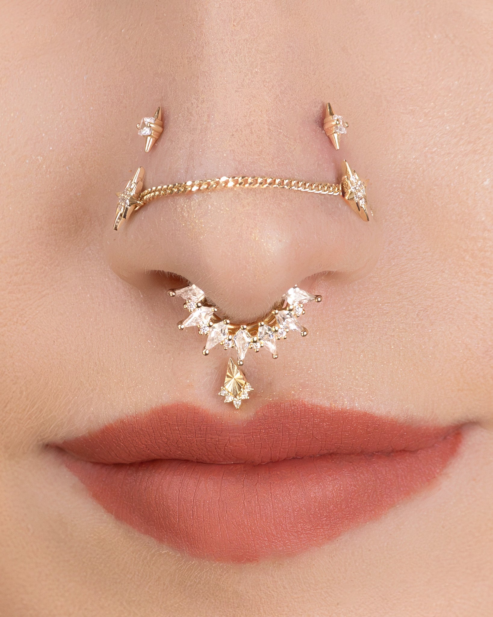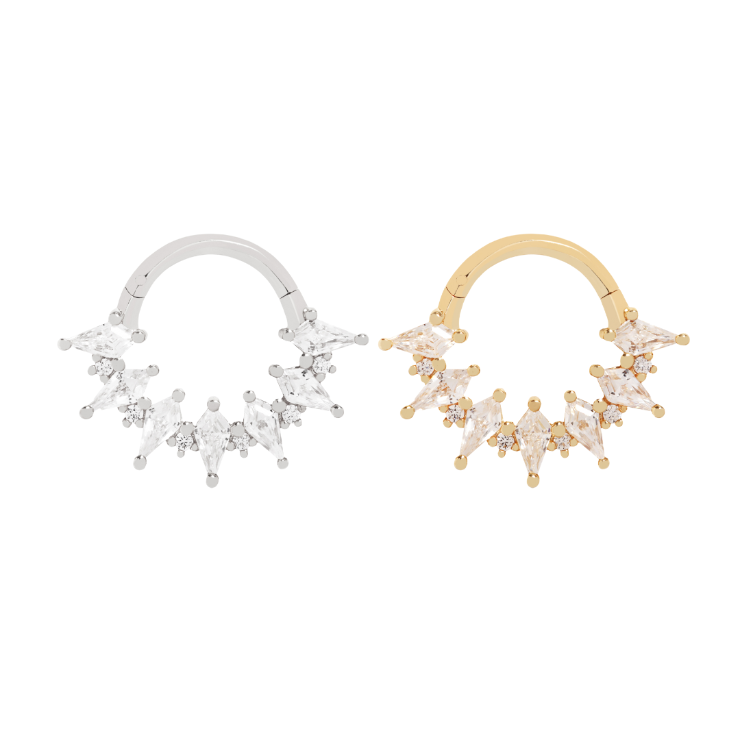 Unveil the magic of Wonderland, a clicker that blends bold design with radiant sparkle. Featuring kite-cut CZs, this septum and daith clicker adds a geometric twist to your piercing, offering a bold yet refined look.