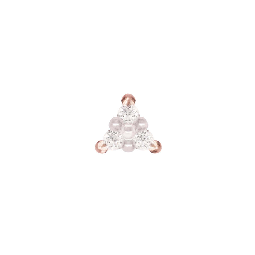 Vibe is a dainty triangle design featuring three round-cut natural diamonds, with white prongs in the center to help each diamond shine brightly. Perfect for those who love understated elegance or want to add a touch of sparkle to a bold curation. This piece brings effortless luxury to any piercing.