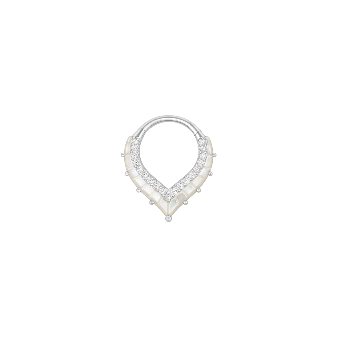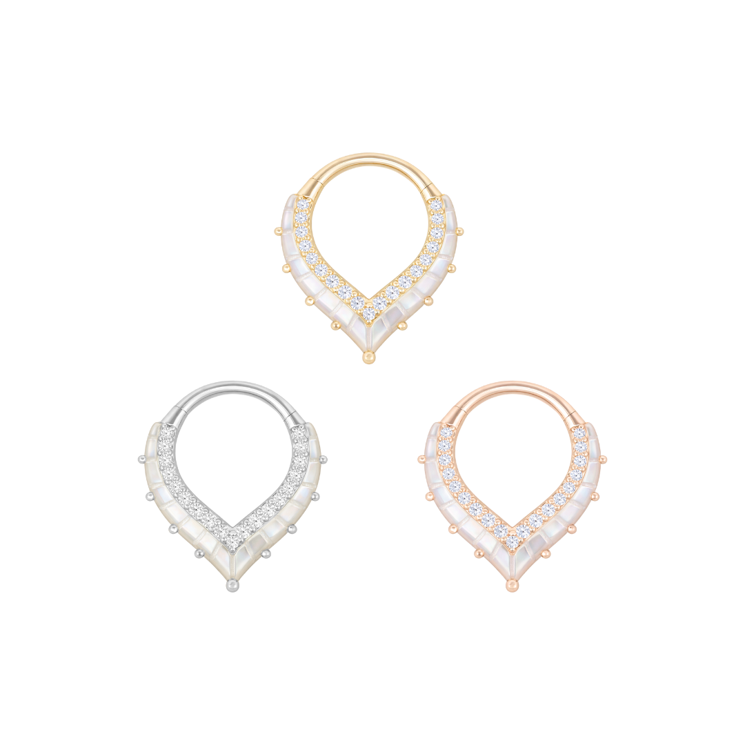 The Arise Clicker features a soft V-shape designed lined with a row of Mother of Pearl and is accented with dazzling CZs. A tribute to where it all began, this design is inspired by Rion’s original “Rise” seam ring, the first reversible, pointed seam ring. Laser-cut texture meets mother of pearl inlay, blending precision engineering with organic beauty.