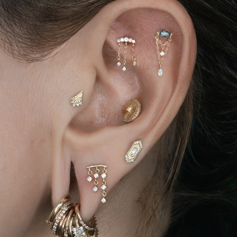 Moving On is all about subtle sparkle with effortless movement, making it a perfect choice for helix, flat, and lobe piercings. An arched row of five round-cut CZ gemstones sits at the top, with three delicate chains below—each finished with a dangling round-cut CZ for light-catching motion.