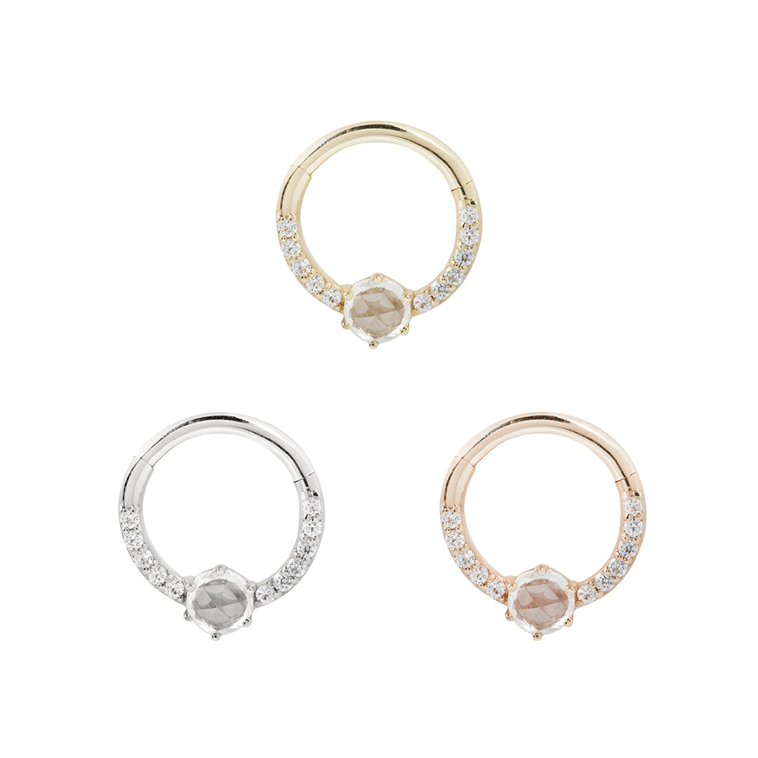 Now taking center stage! This elegant solid gold clicker design is adorned in the middle with a Rose Cut Sapphire, surrounded by 11 Swarovski CZ's. All eyes will be on you! A fabulous piece for a septum or daith piercing!