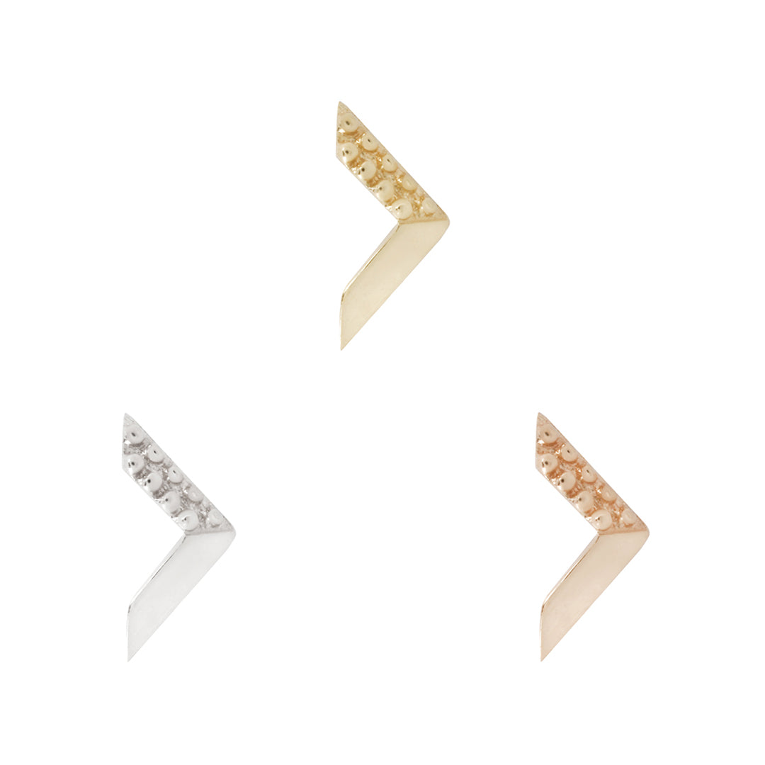 This solid gold arrow design features textured gold on one half and smooth gold on the other.